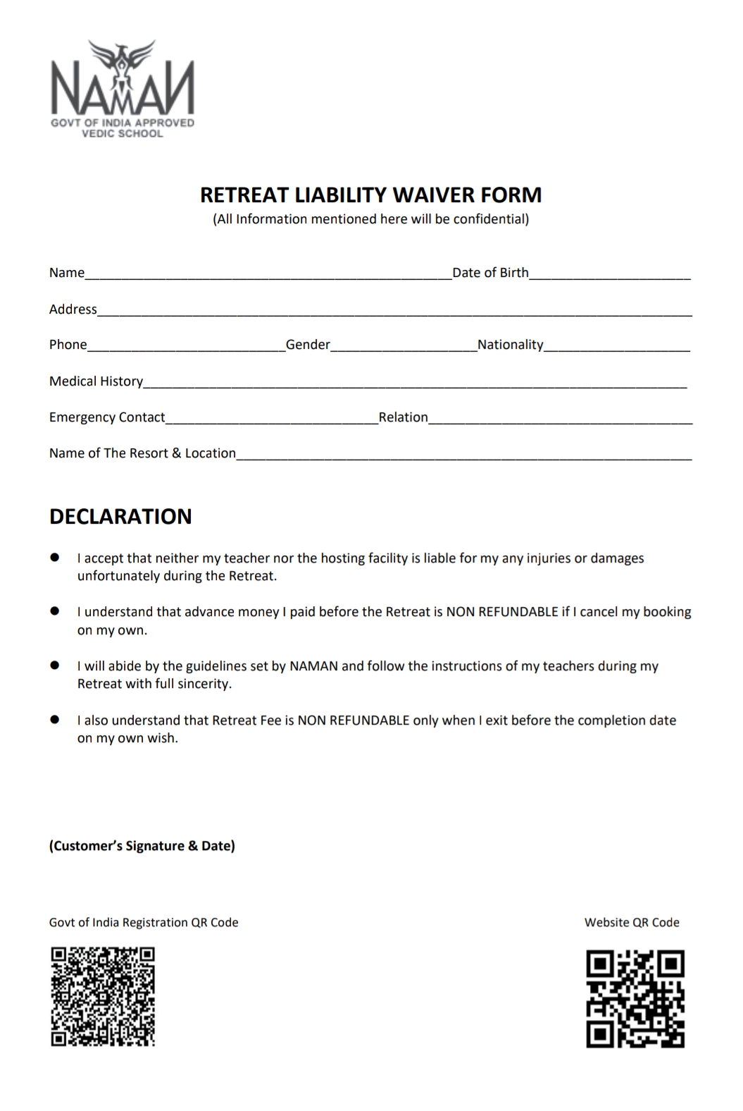 NAMAN provides 2 Days Weekend Spiritual Retreat with Food & Accommodation in KHANDALA, surrounded by forests and hills for a complete relaxing experience. ARRIVAL ON THE LOCATION BY FRIDAY EVENING FOLLOWED BY WELCOME & REGISTRATION PROCESS SOULD BE COMPLETED BY 9 P.M. SATURDAY DAY 1 6 am - 8 am Stretchering & Yoga Asan 8 am - 9 am Breathing Practice & Pranayam 9 am - 10 am Breakfast 10 pm - 12 pm Body Anatomy & Philosophy 12 pm - 4 pm Pure Veg Lunch & Rest Time 4 pm - 6 pm Chakra Kundlini Meditation 6 pm - 8 pm Dinner Fun Time & QNA Session 8 pm - 9 pm Guided Meditation SUNDAY DAY 2 6 am - 8 am Yoga & Acro Yoga Session 8 am - 9 am Breathing Practice & Pranayam 9 am - 10 am Breakfast 10 pm - 12 pm Mantra Chanting & Philosophy 12 pm - 4 pm Pure Veg Lunch & Rest Time 4 pm - 6 pm Transendantal Meditation 6 pm - 8 pm Dinner & Group Discussion 8 pm - 9 pm Closing Ceremony RETREAT COST INR 24000/- Per Couple | 2 Days | Sat & Sun